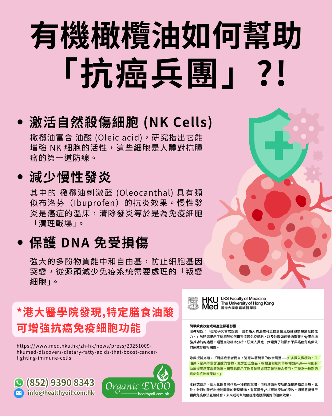 香港大學李嘉誠醫學院(港大醫學院)的一項最新研究發現, 特定膳食脂肪酸能顯著增強人體免疫系統抗擊癌症的能力