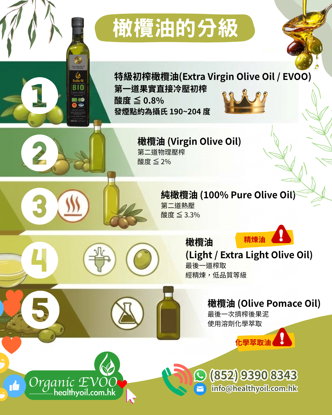 🫒🌟橄欖油的分級指南🫒🌟Lv1 特級初榨橄欖油 (Extra Virgin Olive Oil / EVOO)第一道果實直接物理初榨酸度 ≦ 0.8%發煙點約為攝氏 190~204 度Lv2 橄欖油 (Virgin Olive Oil)第二道物理壓榨酸度 ≦ 2%Lv3 純橄欖油 (10...